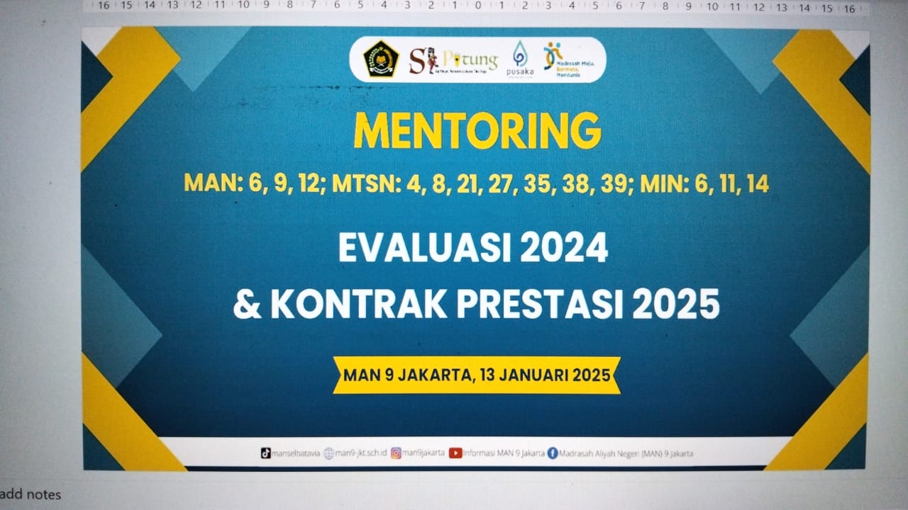 Jakarta (Humas MIN 14 Jakrta Selatan) – Kepala Madrasah Ibtidaiyah Negeri (MIN) 14 Al-Azhar Asy-Syarif, Ru'yat Ismail, bersama bendaharanya menghadiri kegiatan Evaluasi Tahun 2024 dan Rencana Kontrak Prestasi Tahun 2025 yang diselenggarakan Madrasah Aliyah Negeri (MAN) 9 Jakarta Timur. (13/1/2025)
